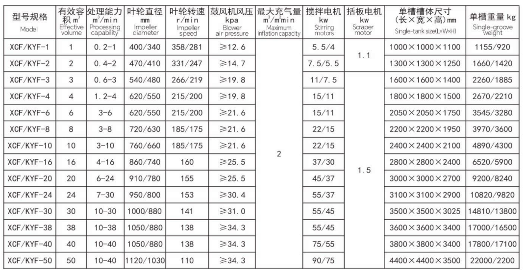 It is suitable for the separation of non-ferrous metals, ferrous metals, precious metals, and non-metallic minerals. The XCF type has self-prime slurry capacity and is called a suction tank; the KYF type has no self-priming slurry capacity, with lower power consumption than the XCF type, and is called a direct-flow tank. Generally, the XCF and KYF models are configured as a combined unit, arranged horizontally to facilitate process changes. The XCF/KYF flotation machine adopts a "U"-shaped tank body, hollow shaft aeration, and a suspended stator, especially a conical impeller with blades tilted backward at an angle. A porous cylindrical air distributor is installed in the impeller cavity, enabling air to be uniformly dispersed in most areas of the impeller blades, thus providing a larger slurry-air contact interface. When the XCF flotation machine operates, as the impeller rotates, the slurry in the tank is sucked into the space between the impeller blades from around the tank bottom through the lower end of the impeller. Meanwhile, low-pressure air supplied by a blower enters through the hollow shaft and the impeller's air distributor. After the slurry and air are fully mixed between the blades, the mixture is pushed obliquely upward from the upper half of the impeller, and then enters the entire tank after being stabilized and directed by the stator. Bubbles rise to the foam stabilization zone. After the enrichment process, the foam overflows spontaneously from the overflow weir into the foam tank. A portion of the slurry flows to the lower part of the impeller, which is then stirred by the impeller and remixed to form mineralized bubbles. The remaining slurry flows to the next tank and finally becomes tailings.