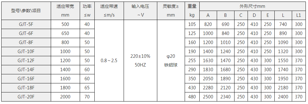 GJT-F系列金属探测仪采用可拼装的差动变压器式传感器,在电路设计中采用了新金属检测技术-数字移相及相关检测技术,具有性能稳定可靠,检测灵敏度高,较强的物料抑制特性,优良的抗干扰能力。该产品主要用于火力发电、水泥、建材、造纸、矿山、食品、化工等行业中,对原料中混杂的各种金属物质进行检测,它是利用金属进入传感器电磁场时所产生的感应信号,经过信号放大处理电路来驱动执行机构动作,从而达到检测出有害金属。