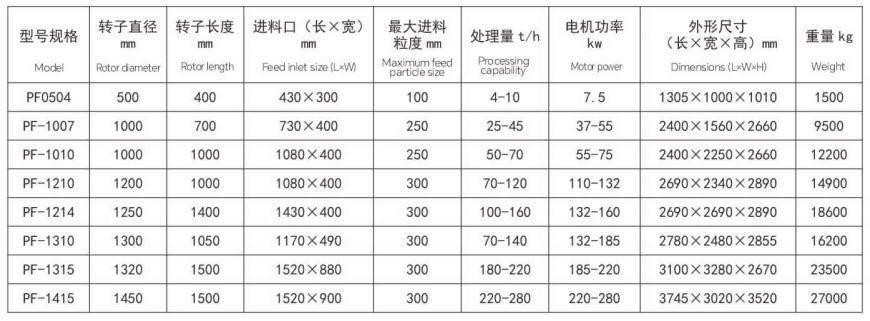 The impact crusher is mainly used for medium and fine crushing of materials. Its discharge particle size can be adjusted, with diverse crushing specifications. It boasts advantages such as a large crushing ratio and cubic-shaped crushed materials. As a crushing machine that utilizes impact energy for material crushing, during operation, the rotor rotates at high speed driven by the motor. When materials enter the plate hammer action area, they collide with the plate hammers on the rotor and are crushed, then thrown onto the impact device for re-crushing. Subsequently, they bounce back from the impact liner to the plate hammer action area for further crushing. This process repeats: materials enter the first, second, and third impact chambers in descending order of size, undergoing repeated crushing until they reach the required particle size and are discharged through the discharge port. Adjusting the gap between the impact frame and the rotor can alter the discharge particle size and shape of the materials.