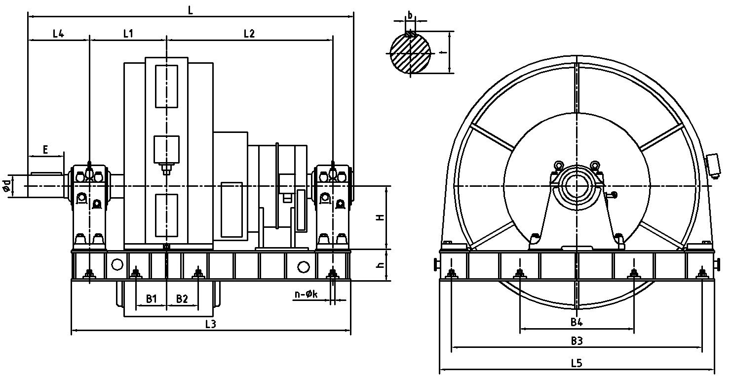 | Type | B1 | B2 | B3 | B4 | b | t | Φd | E | H | h | L | L1 | L2 | L3 | L4 | L5 | n | ΦK | Voltage (kV) |