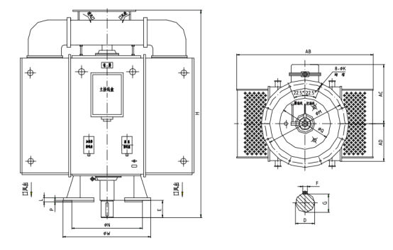 1.This motor series adopts a box-type structure. The frame is welded from steel plates into a box shape with reinforcement ribs, providing excellent strength. The motor is equipped with protective covers or coolers, facilitating heat dissipation, installation, and maintenance.